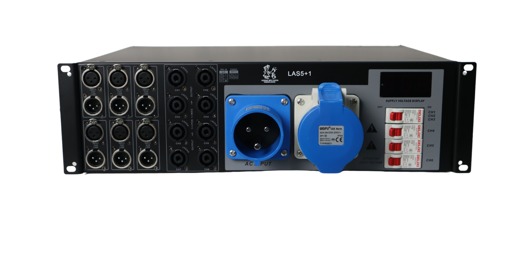 Mỗi kênh có công tắc không khí riêng, tự động ngắt khi ngắn mạch hoặc quá dòng để bảo vệ thiết bị âm thanh |
